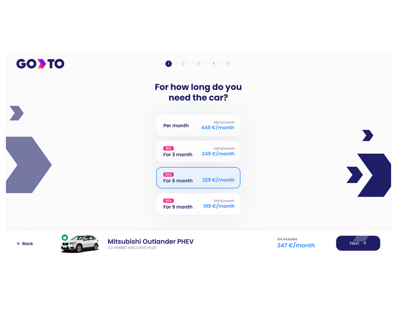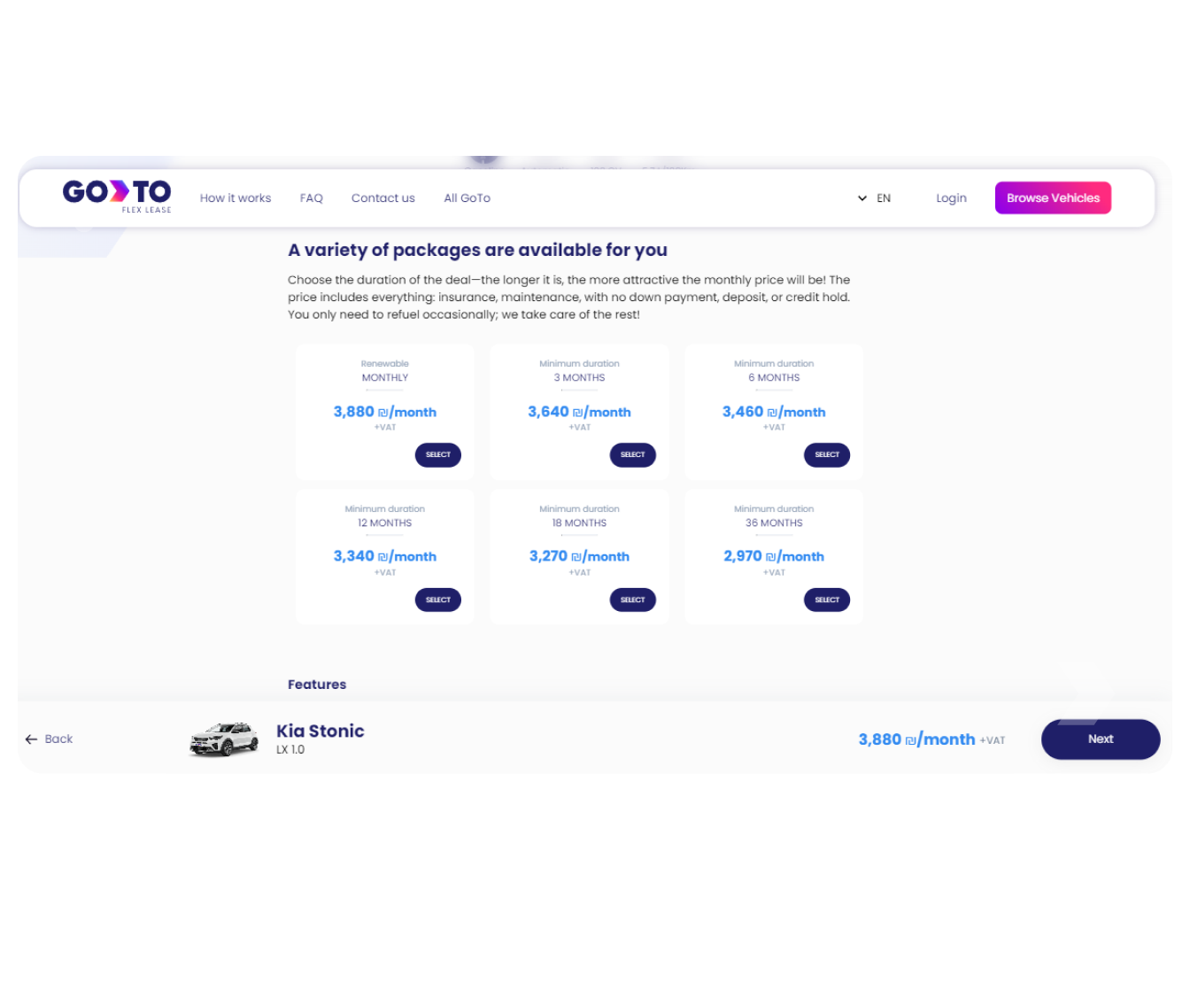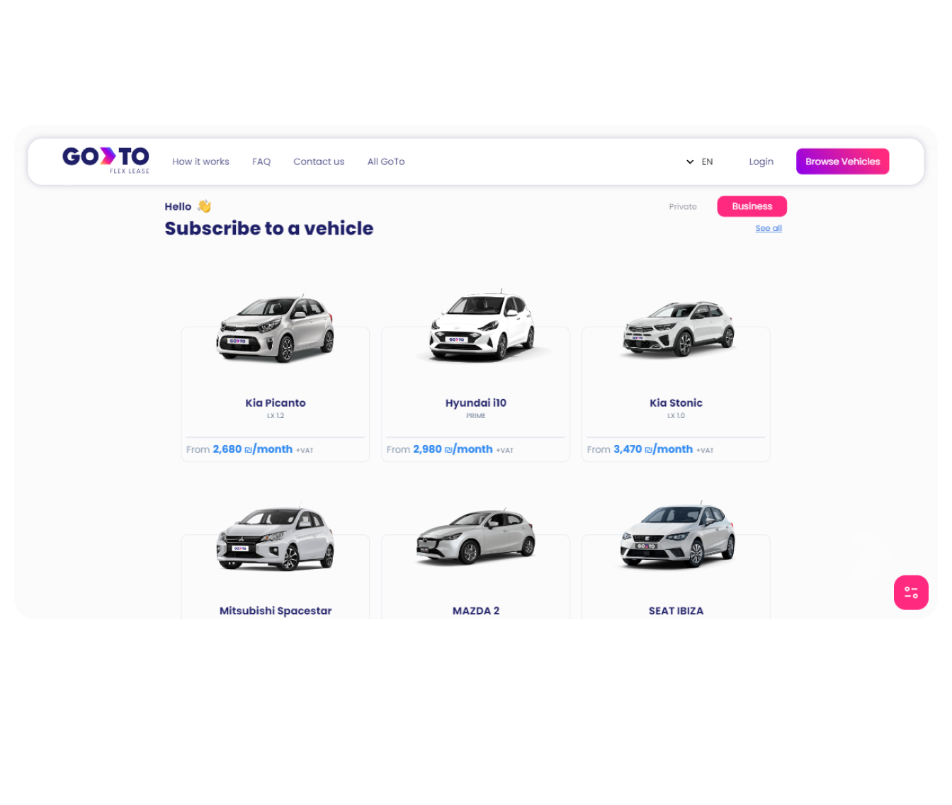 With GoTo Flex Lease, you can drive a car without having to buy one. Our flexible leasing option offers fixed monthly payments, instead of a big upfront cost. You’ll get a car delivered to your doorstep, completely fuelled and spotless, along with a maintenance plan, helping you save cash, and time, and avoid any hassles.