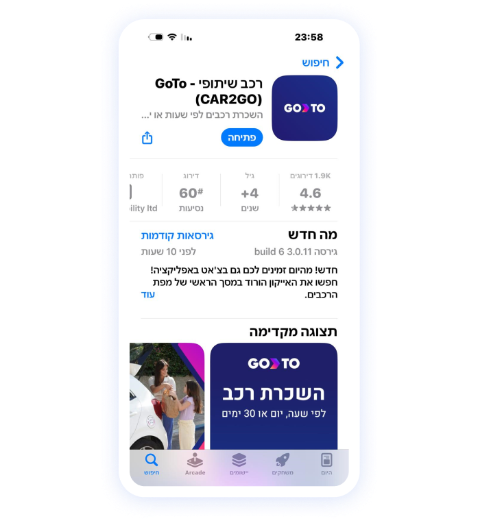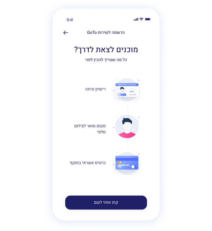 מורידים את אפליקציית GoTo ומסיימים הרשמה תוך דקות בכמה קליקים. הכינו מראש- רישיון נהיגה בתוקף ואמצעי תשלום.