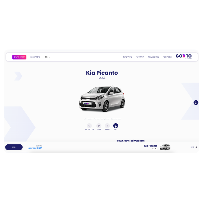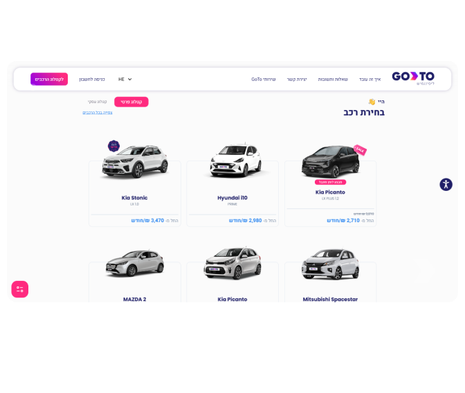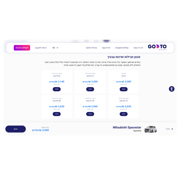 כל השאלותתכירו את השירות החדש והדיגיטלי של GoTo – ליסינגמיש! רכב כמנוי לתקופות משתנות, מחודש ועד שתחליטו להפסיק. החל מחודש ועד 36 חודשים, בתנאים גמישים מליסינג קלאסי ובמחיר זול יותר מהשכרת רכב. מהיוםכבר לא צריך להשתעבד לקניית רכב, לא לפרק חסכונות או לקחת מקדמה. איתנו לא צריך להתחייב לקניה של רכב לשנים קדימה, אנחנו מבינים שבעולם תזיזזיתי ומטורף שכלום לא צפוי, חייבים מקסימום דימניות וגמישות.